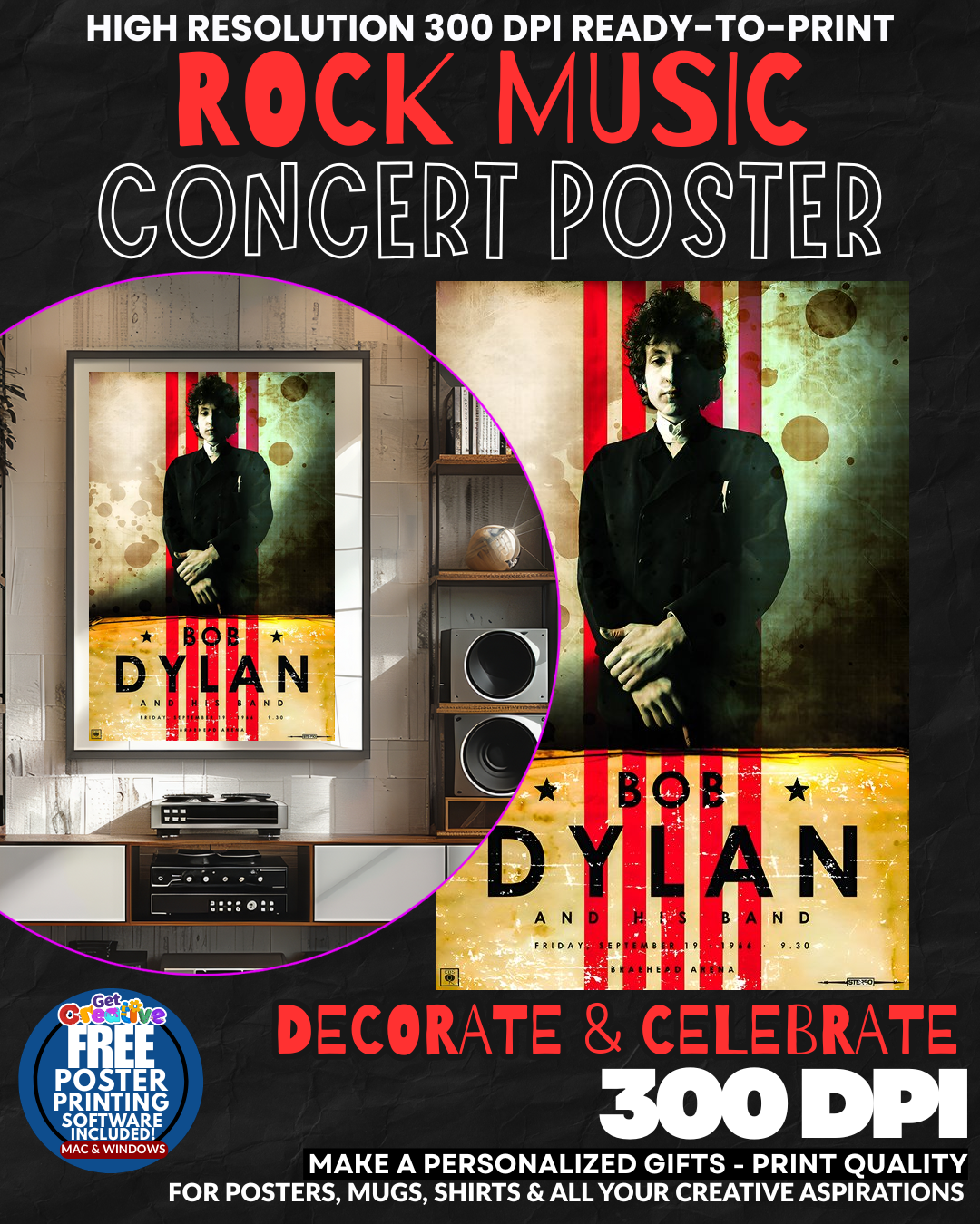 BRING THE VOICE OF A GENERATION INTO YOUR SPACE! Transform any wall into a SHRINE TO FOLK ROCK ROYALTY with this stunning Bob Dylan concert poster! Feel the raw POWER and poetic genius of the legendary troubadour watching over your room every single day! This isn’t just wall art – it’s a DECLARATION that you understand true musical greatness! Let Dylan’s piercing gaze and timeless mystique elevate your space with the sophisticated edge that only comes from honoring a TRUE ICON! GRAB this piece of rock history before it’s gone!