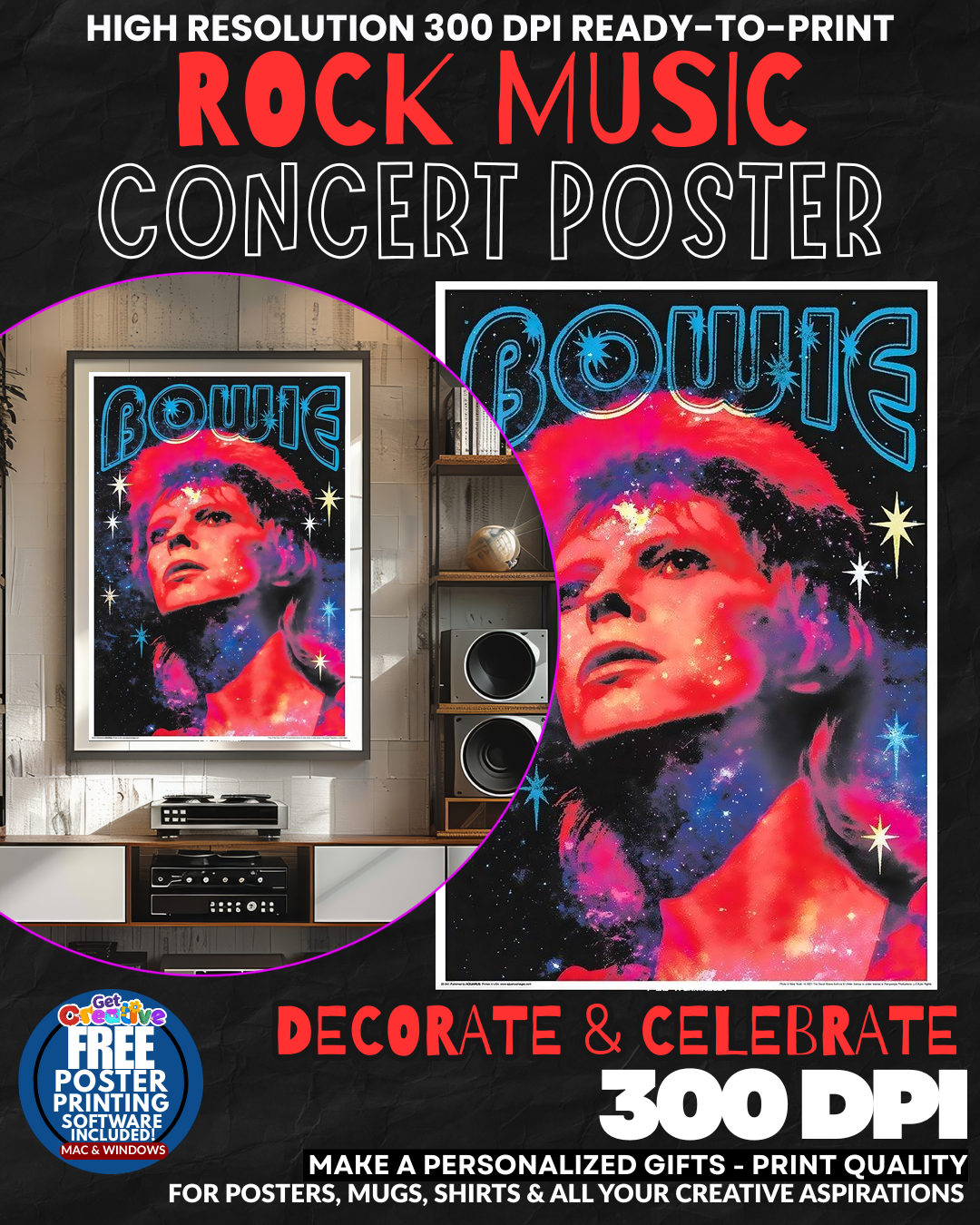 BRING THE STARMAN’S ELECTRIC MAGIC HOME! Transform your space into a GLAM ROCK SHRINE with this STUNNING David Bowie concert poster that captures the LEGENDARY ZIGGY STARDUST in all his diamond-encrusted glory! Feel the THUNDEROUS ENERGY of rock history’s most ICONIC PERFORMER radiating from your walls as this museum-quality artwork commands INSTANT RESPECT from every music lover who enters! Your guests will be MESMERIZED by the sheer STAR POWER and sophisticated rock royalty that only THE THIN WHITE DUKE himself could deliver! GRAB this piece of rock and roll IMMORTALITY today!
