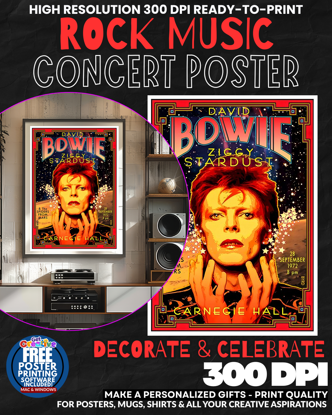 BRING THE ZIGGY STARDUST REVOLUTION TO YOUR WALLS! Transform your space into a GLAM ROCK SANCTUARY with this ELECTRIFYING David Bowie concert poster that captures the RAW MAGNETISM and OTHERWORLDLY CHARISMA of rock’s greatest shapeshifter! Feel the THUNDEROUS ENERGY of Bowie’s legendary performances radiating from your wall as this STUNNING tribute celebrates the DIAMOND DOG himself in all his STARMAN GLORY! Your guests will be MESMERIZED by the COSMIC POWER and ARTISTIC BRILLIANCE that made Bowie the ultimate ROCK AND ROLL ALIEN! GRAB this piece of music history and let the BOWIE MAGIC electrify your home today!