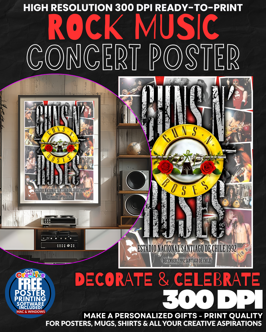 ROCK LEGEND WALL POWER! Transform your space into a ROCK AND ROLL SANCTUARY with this ELECTRIFYING Guns N Roses concert poster that SCREAMS pure musical rebellion! Feel the RAW ENERGY and UNSTOPPABLE ATTITUDE of rock’s most DANGEROUS band every time you walk into the room! This isn’t just wall art – it’s a DECLARATION of your rock soul that brings the THUNDEROUS POWER of stadium concerts directly into your personal domain! Your walls will PULSE with the same rebellious spirit that made GNR legends! GRAB this rock masterpiece NOW!
