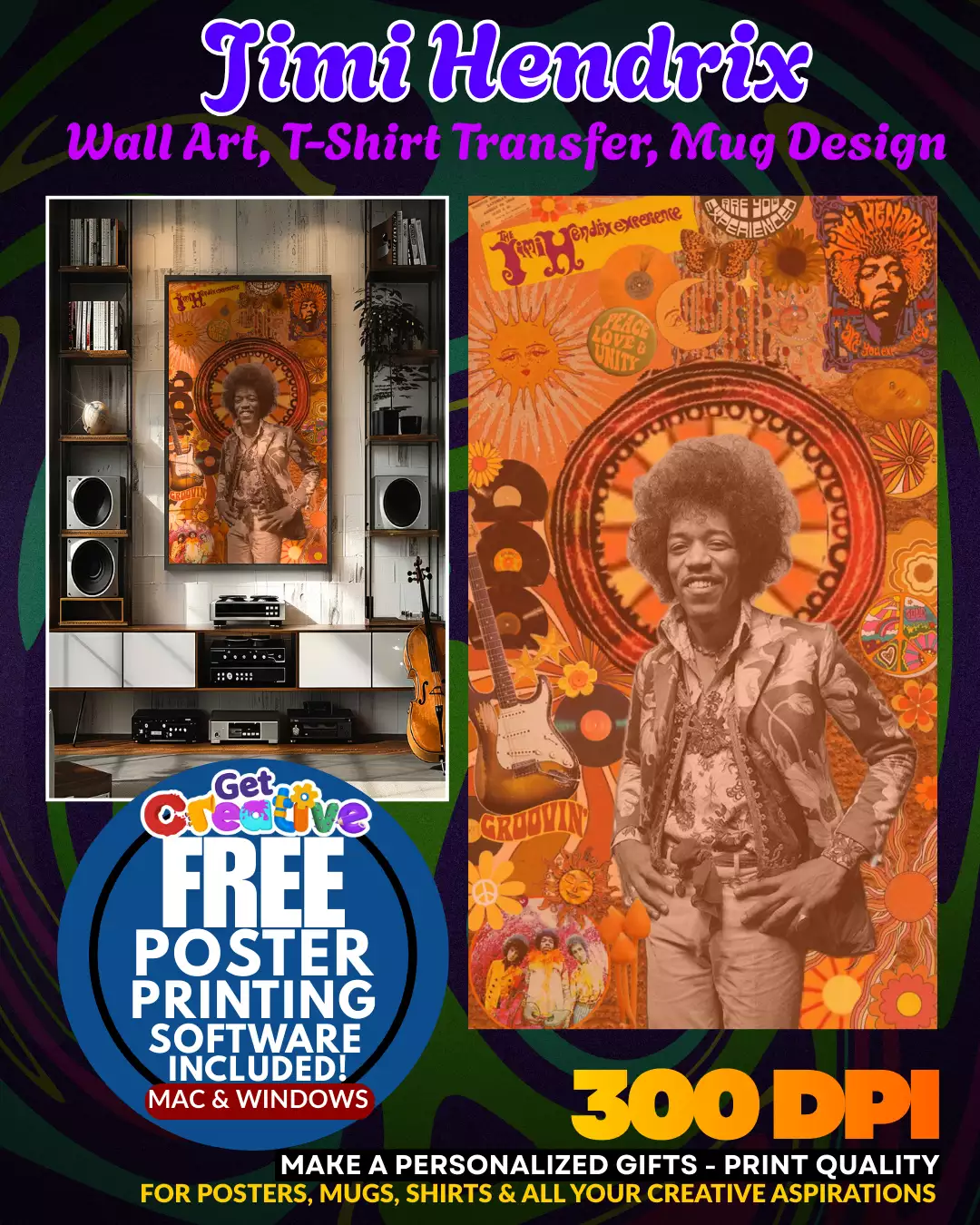Jimi Hendrix Wall Art Transfers Poster Pinup. Iconic wall art featuring a classic pinup design with a unique transfer aesthetic. Perfect for music enthusiasts.