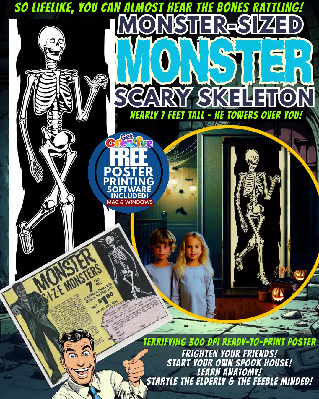 IT’s THE RETURN OF THE BONEY SKELETON! The PRIMEVAL ARTIFACT that stares back from the deepest sleep! This SPECTACULAR DISPLAY embodies the CLAMMY DREAD of man’s ultimate fate! Challenge the grave itself! Display this ULTIMATE PRIZE and prove you fear nothing of the hereafter! SECURE THIS ANATOMICAL FIEND NOW! A staggering reproduction print of a comic book classic, can print out as tall as 7 feet in 300 DPI quality.