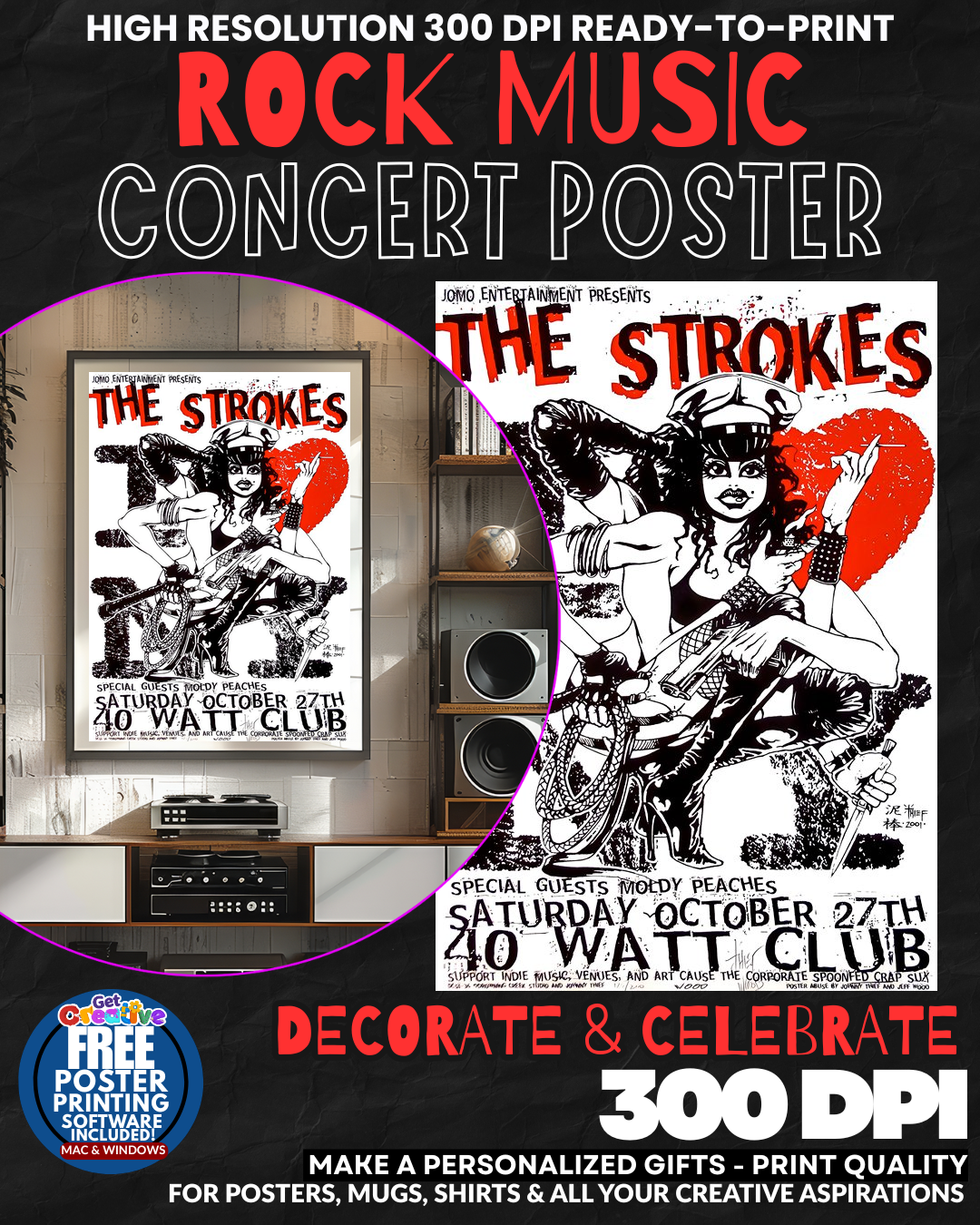 The Strokes 1 Music Rock Concert Poster Wall Art. An official poster depicting the iconic rock band, perfect for music enthusiasts and fans to display.